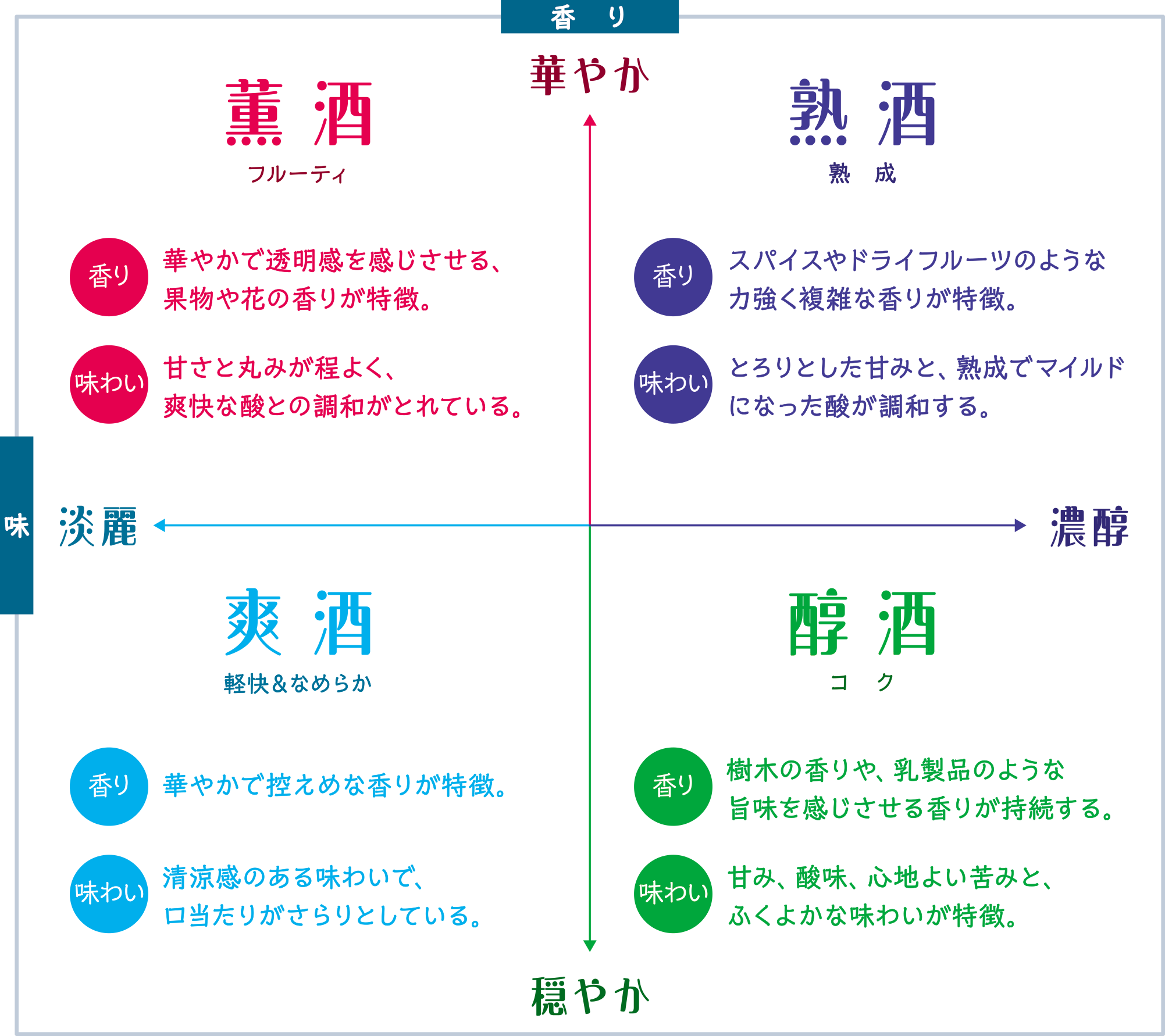 これらを分類すると香りの高いタイプ、軽快でなめらかなタイプ、コクのあるタイプに分けることができます。この4タイプのお酒に富山の代表的料理のどれが相性があるかを調べたのが下図です。一度お試し下さい。
